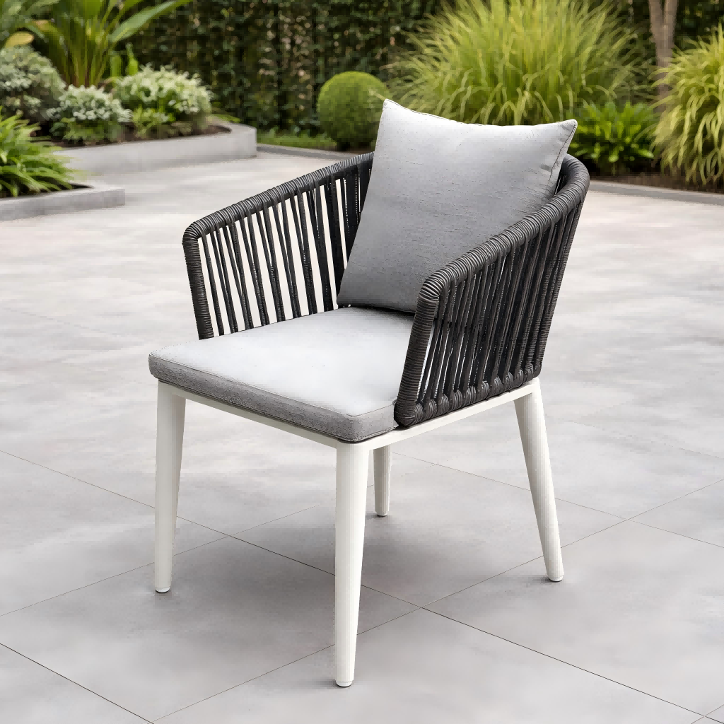 Jídelní židle mají opěradlo tkané z lana, které vytváří moderní a elegantní vzhled a zároveň poskytuje pohodlnou oporu. Rám je vyroben z hliníku s práškovým nástřikem, který nabízí vynikající odolnost proti korozi a venkovním povětrnostním vlivům.